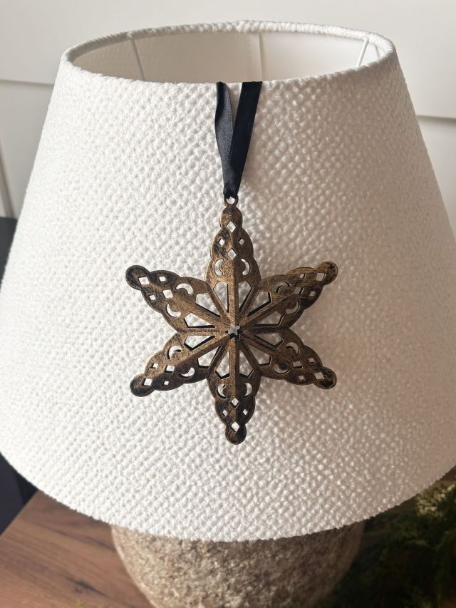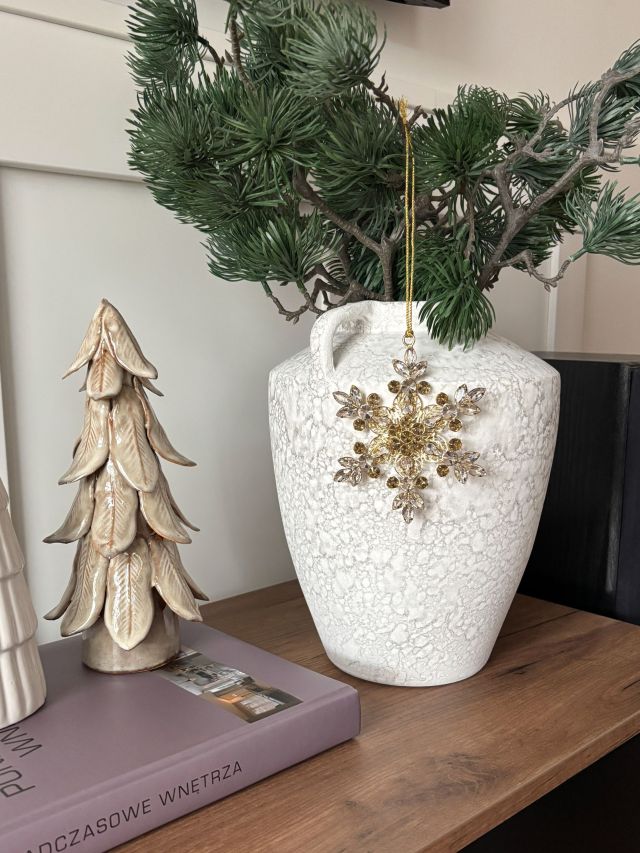 Luksusowa zawieszka świąteczna – śnieżynka z kryształków w złotej ramce. Idealna do dekoracji drzewka, girland, stroików lub okien, nadając wnętrzom wyjątkowego, świetlistego akcentu.