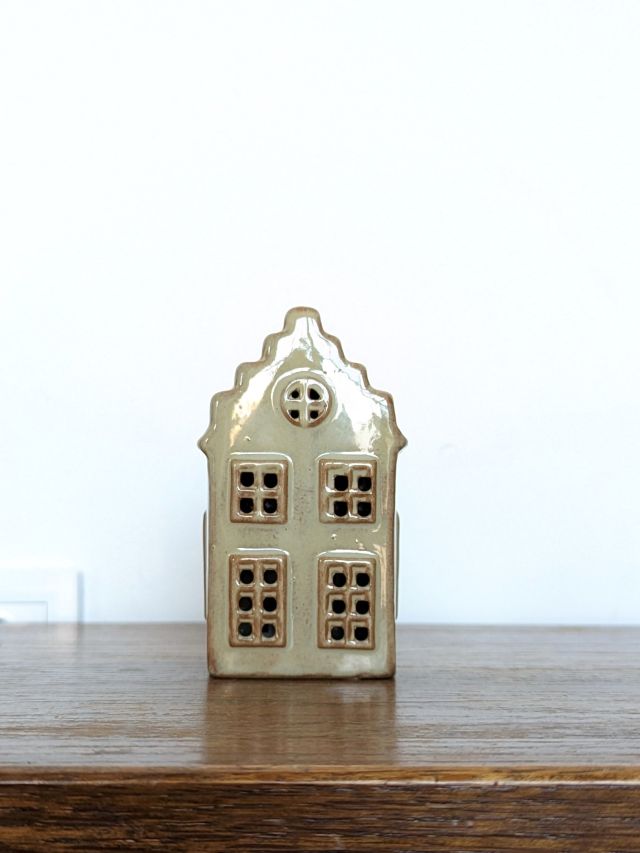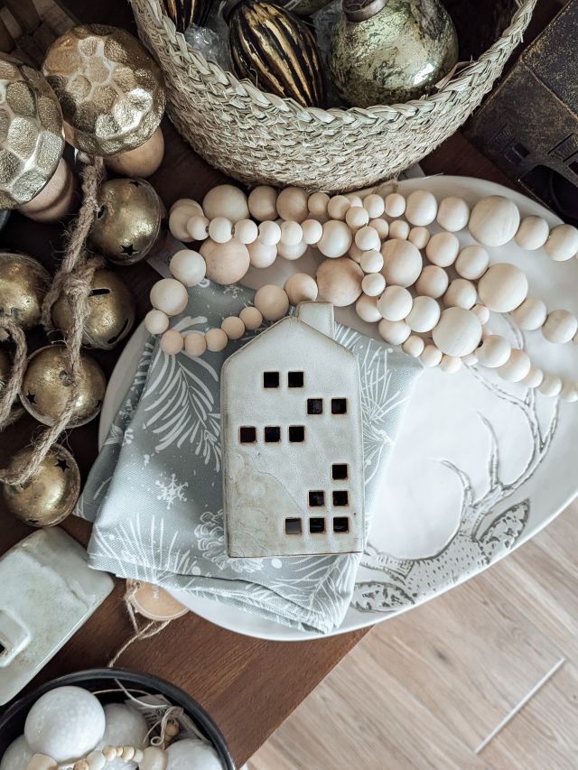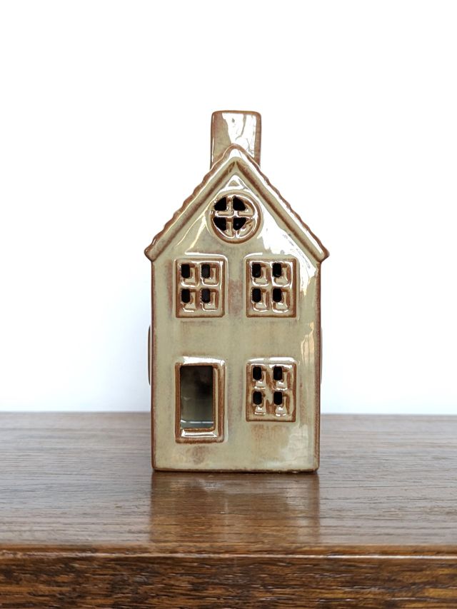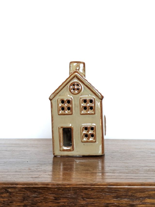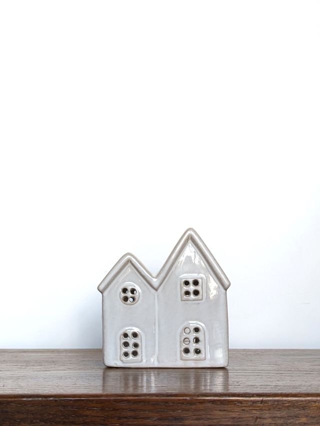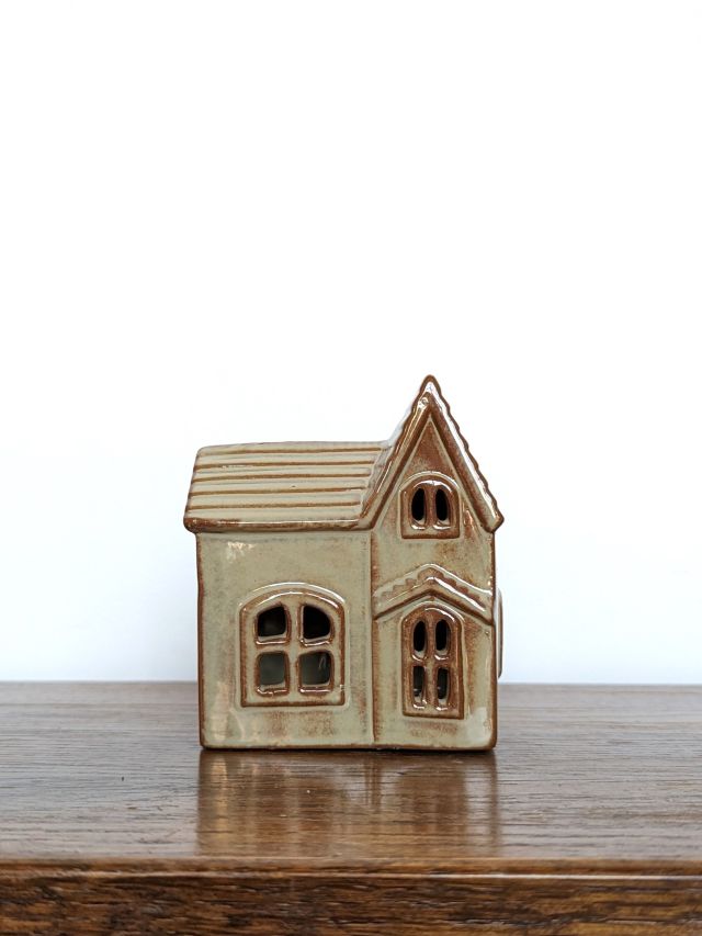 Dekoracyjny domek ceramiczny w beżowym kolorze, z delikatnym oświetleniem LED. Tworzy ciepły, świąteczny nastrój i pięknie prezentuje się jako zimowa ozdoba stołu, półki lub komody.