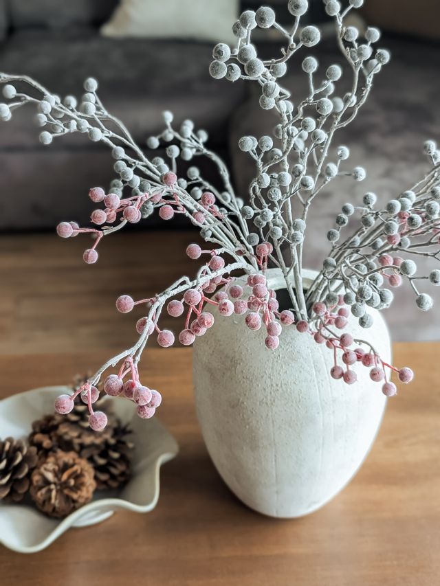 Czerwona gałązka ozdobna z drobnymi kuleczkami pokrytymi delikatnym szronem to elegancka dekoracja zimowa. Wykonana z tworzywa sztucznego, idealna do wazonów, stroików i świątecznych aranżacji. Sztywna, ale formowalna końcówka umożliwia łatwe dopasowanie do kompozycji.