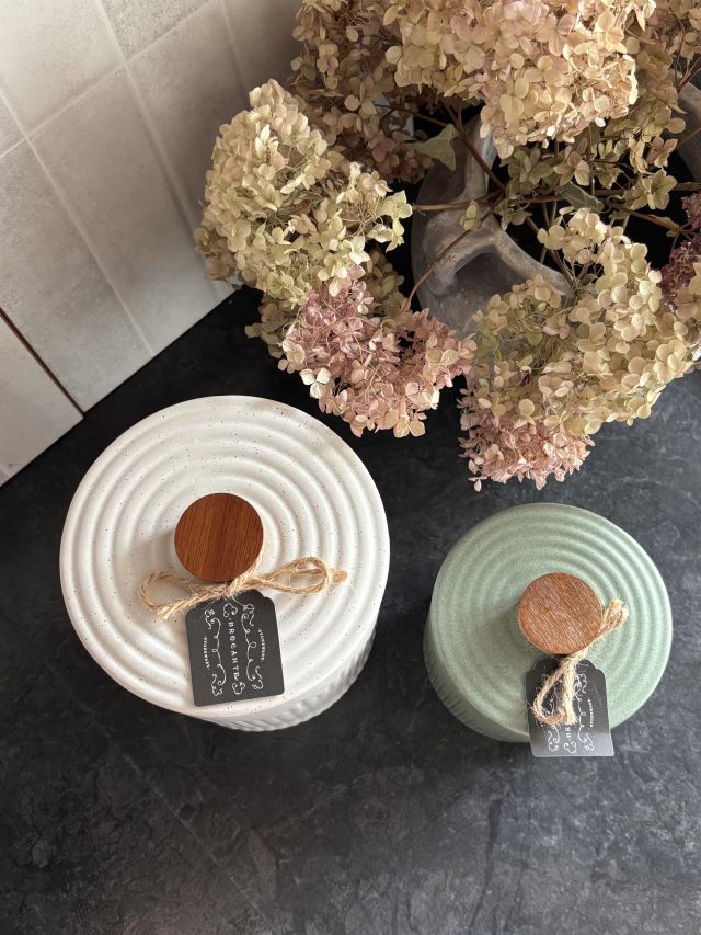 Pojemnik z kamionki w zielonym kolorze, z prostym żłobieniem i drewnianym akcentem na pokrywce. Idealny do przechowywania w kuchni w stylu rustykalnym, farmhouse czy organicznym.