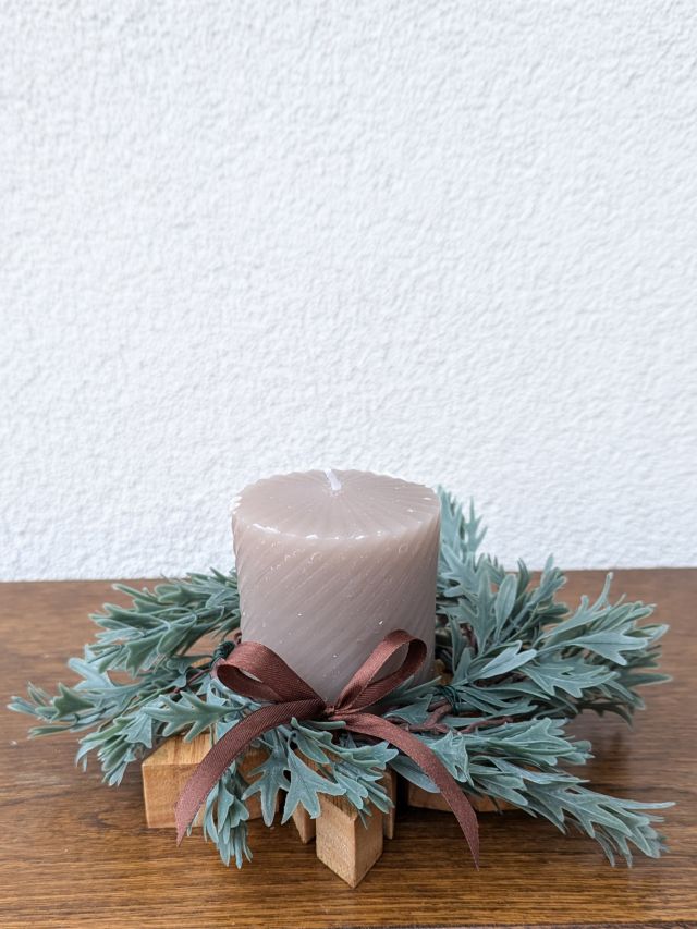 Elegancki stroik świąteczny na Boże Narodzenie z drewnianą podstawką w kształcie gwiazdki, udekorowany wiankiem z zielonych, realistycznych gałązek, brązową kokardką oraz świecą w ciepłym brązie. Idealny jako ozdoba stołu, komody, konsoli lub prezent świąteczny.