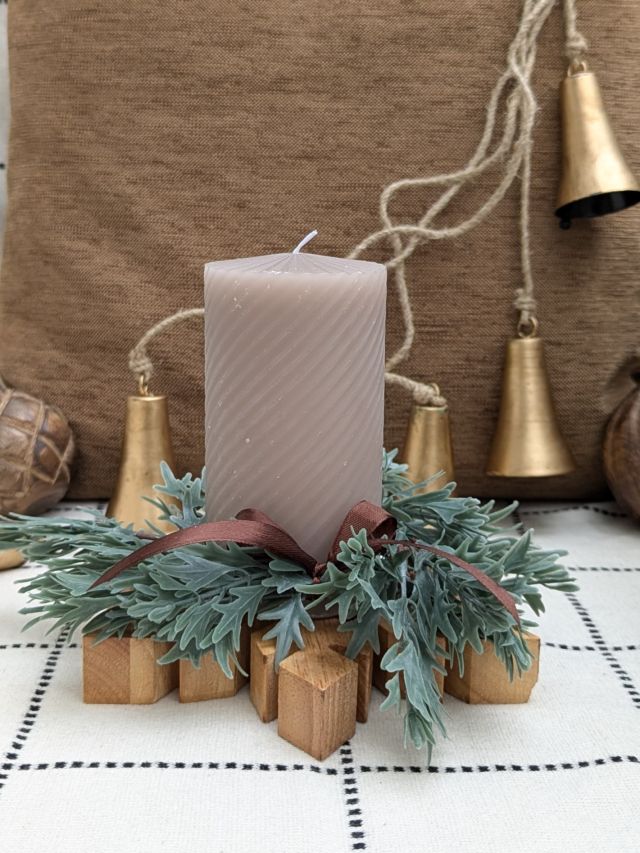 W zestawie znajduje się podstawka w kształcie gwiazdki, wianek z gałązek z kokarką i świeca.